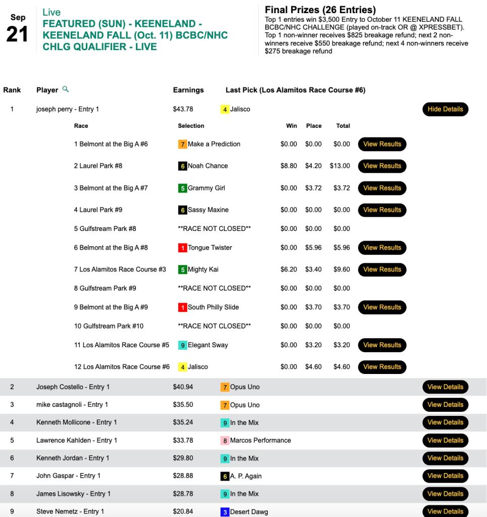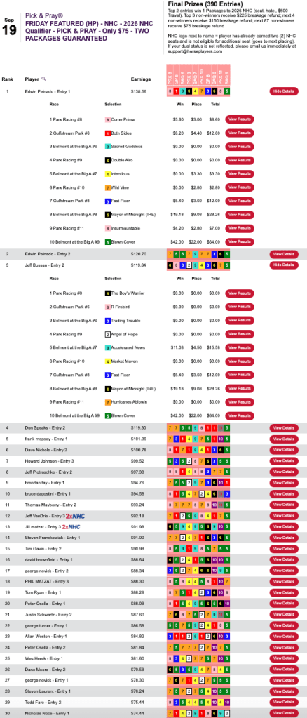 Peinado filled the top two spots on the leaderboard in what was a gaudy display of handicapping acumen. Unfortunately for Peinado, NTRA rules state that a player may only earn one NHC entry in any given qualifier. So the second available Vegas package fell to third-place contestant Jeff Bussan, who had Blown Cover plus 3 other winners.