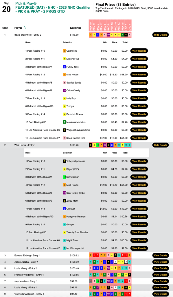 David Brownfield may have turned in the best handicapping performance of the week in Saturday’s $165 NHC Pick & Pray qualifier here at HorseTourneys.