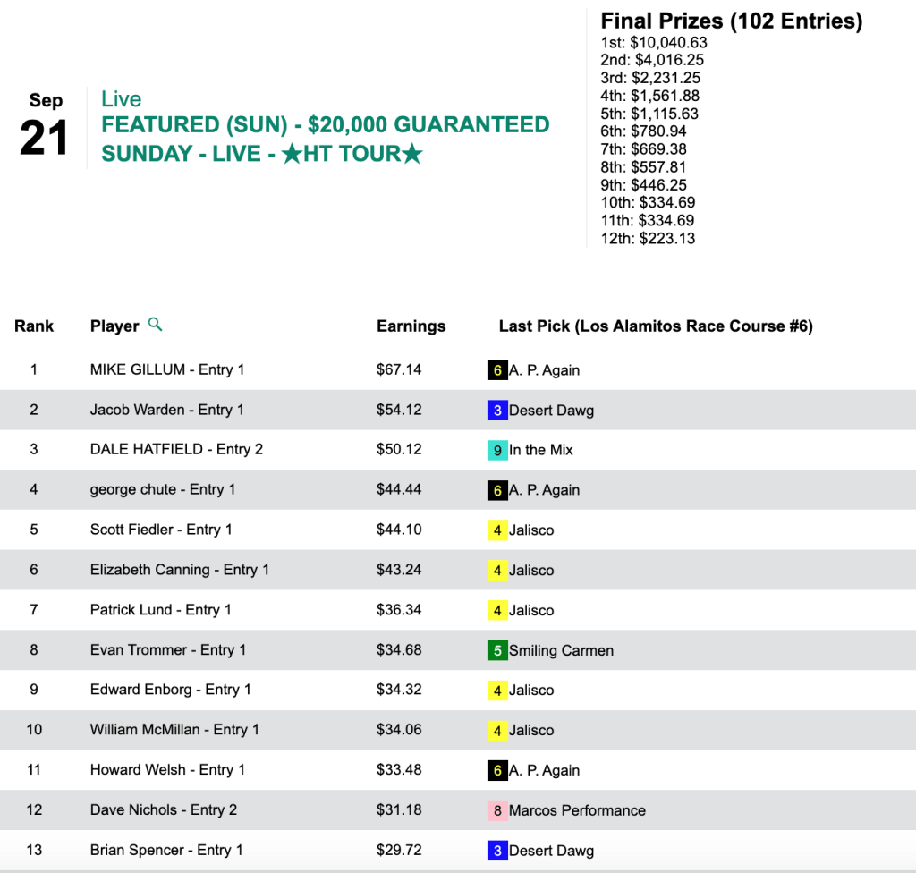 Gillum stockpiled 7 winners and 1 runner up from the 9 races to earn $10,040 in Sunday’s HT Tour battle, our $20,000 Guaranteed game, which closed with a final pot of $22,312. Gillum had the “bomb” of the day in Three Thirteen ($10.24, $5.54) in race 6 at BAQ.