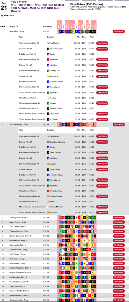 That 5th race at BAQ was not part of our 12-race featured schedules (reduced to 9 races after the Gulfstream card termination). As a result, scores were low and the pathways to victory were narrow, indeed. The top 9-race performance—by a fairly comfortable margin—was turned in by 2024 NHC champion Mike Gillum.