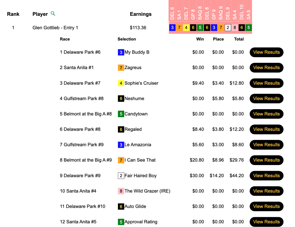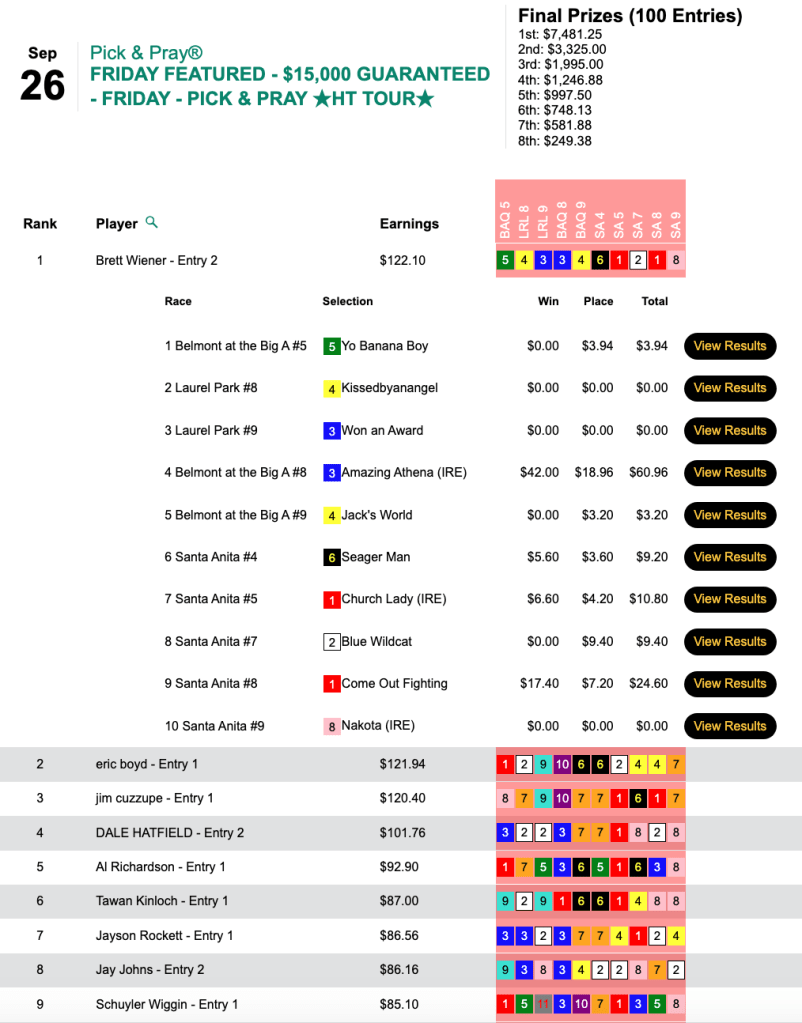 This effort resulted in a tangible, non-points payoff too. Wiener won $7,481 in a game that was ultimately worth a total of $16,625. His most amazing collection among 4 winners and 3 runners up was 31-1 victress Amazing Athena.