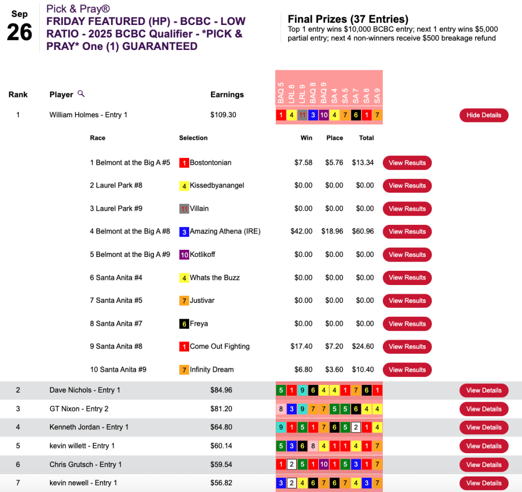 Holmes exited with the $10,000 seat at the conclusion of Friday’s Breeders’ Cup Betting Challenge Low Ratio qualifier at HorsePlayers. Dave Nichols had to settle for a $5,000 partial BCBC entry for his second-place performance in this get together.