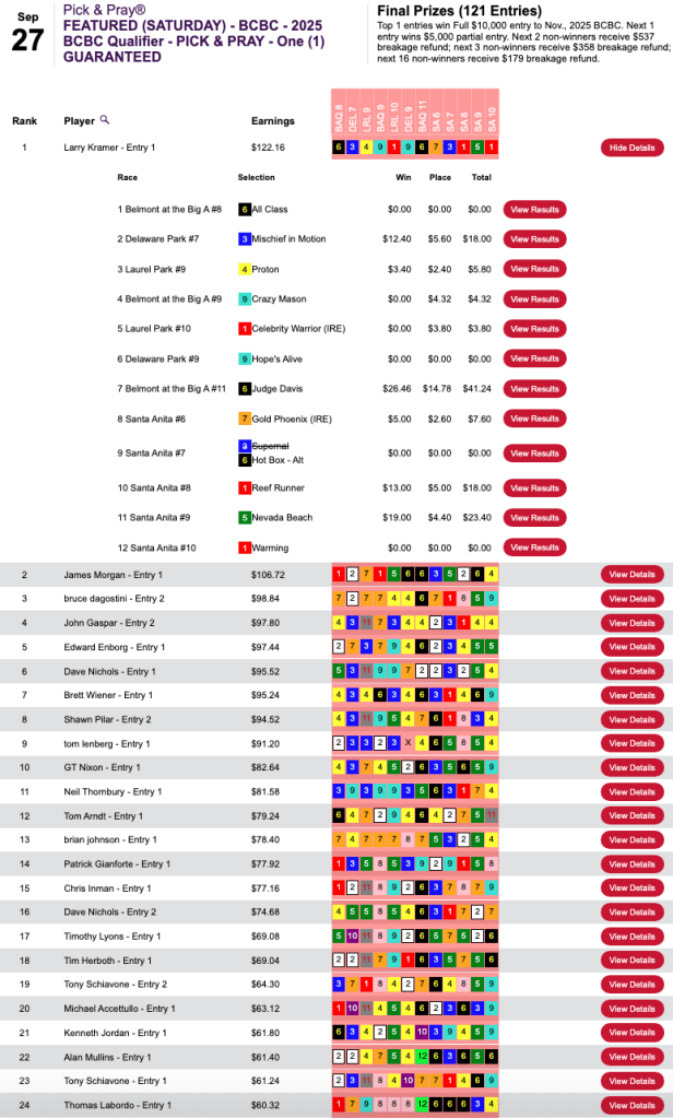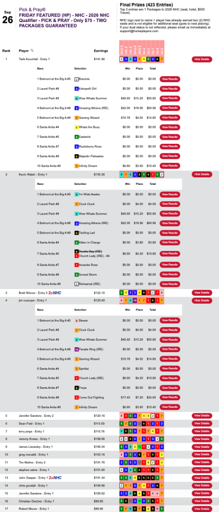 Kouchtaf posted the high score of the day in taking Friday’s $75 NHC qualifier at HorsePlayers. Kouchtaf picked 4 winners. Both of the day’s big prices were among the four—Wow Whata Summer ($40.60, $15.20) in the 9th at Laurel and Amazing Athena ($64.18, $18.96) in race 8 at BAQ. Also punching his ticket to Vegas was runner up Kevin Walsh (3W, 2P). He, too, smoked out both of the $40.00+ horses. There were enough entrants for a third berth to be bestowed. The third-place finisher, NHC Hall of Famer Brett Wiener was already double qualified, though. So that left the remaining spot to Jim Cuzzupe, who counted Wow Whata Summer among his 5 wins and a place.