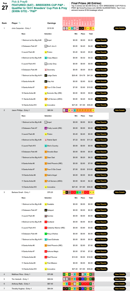 That wraps up another fun week of featured-tourney action. Next week promises to be even more exciting with many Breeders’ Cup preps taking place around the country…including at Keeneland, where their Fall meet opens up on Friday. Until then…good luck!
