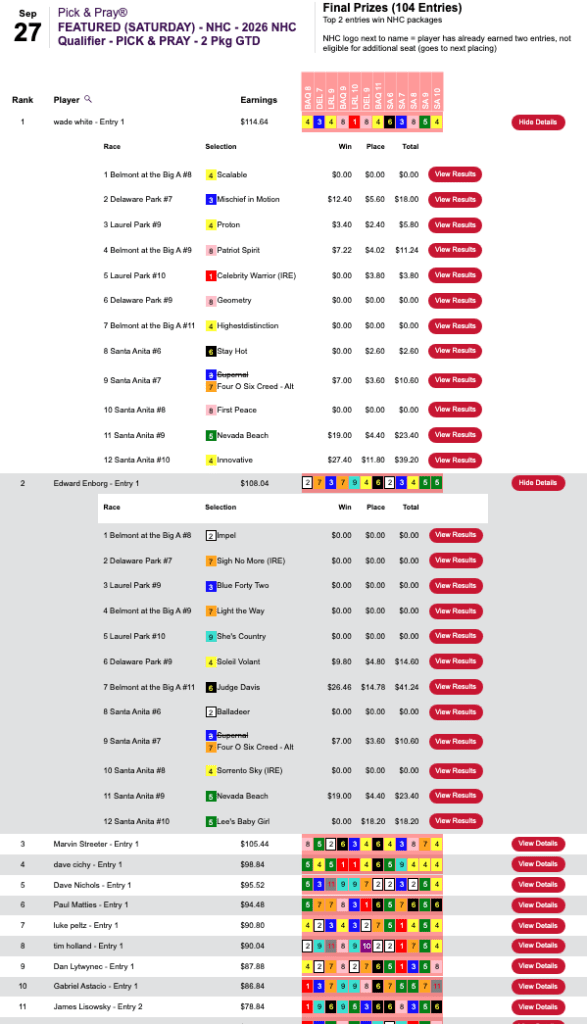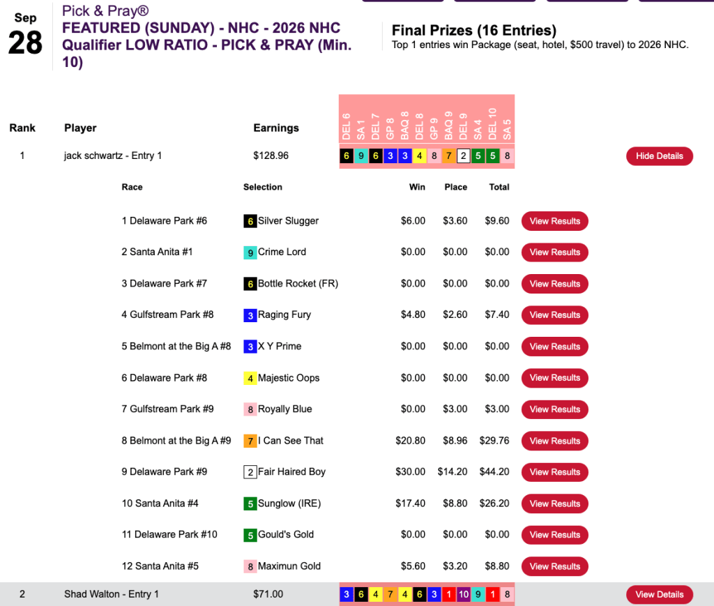 When Schwartz woke up on Sunday, he was technically on the outside looking in with respect to the 2026 NHC. I say “technically” because he had already accumulated 17,963 NHC Tour points, making him a veritable lock to finish in the “Top 75 Not Otherwise Qualified.” Nevertheless, Schwartz remained eligible for Sunday’s $210 NHC qualifier at HorsePlayers—an event restricted to those who had yet to officially secure a 2026 berth. Thanks to 6 winners—including Fair Haired Boy ($30.00, $14.20) in race 9 at Delaware—plus a place, Schwartz defeated 50 rivals by $31.90.