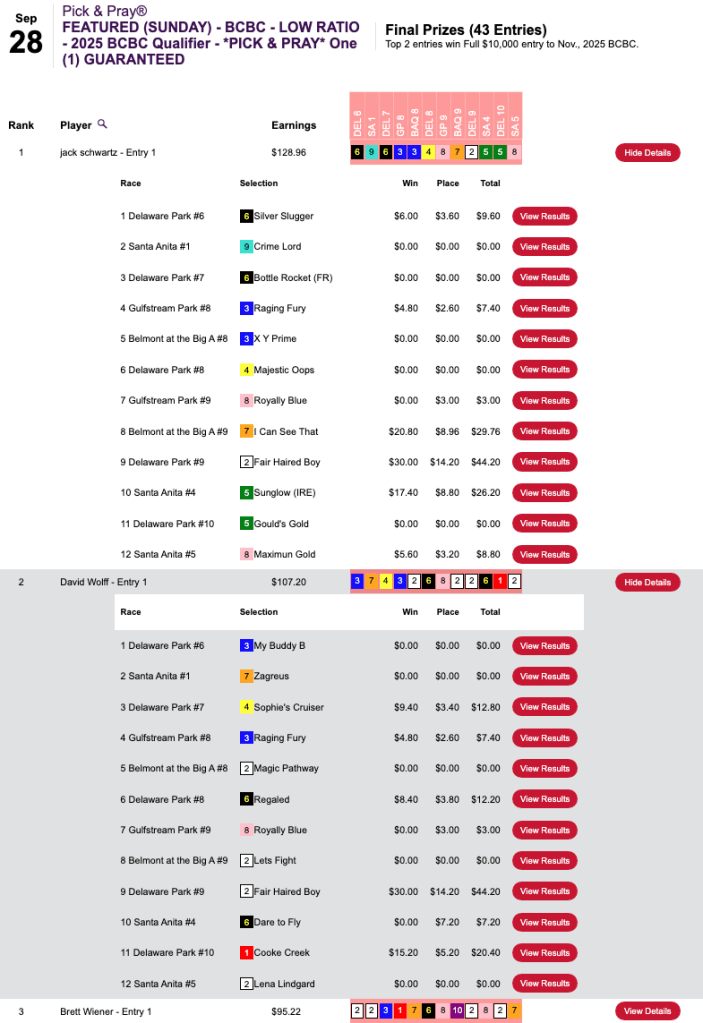 By entering those same, prescient selections in Sunday’s Breeders’ Cup Betting Challenge Low Ratio qualifier, Schwartz made it a clean sweep of the three Sunday featured tourneys at HorsePlayers.