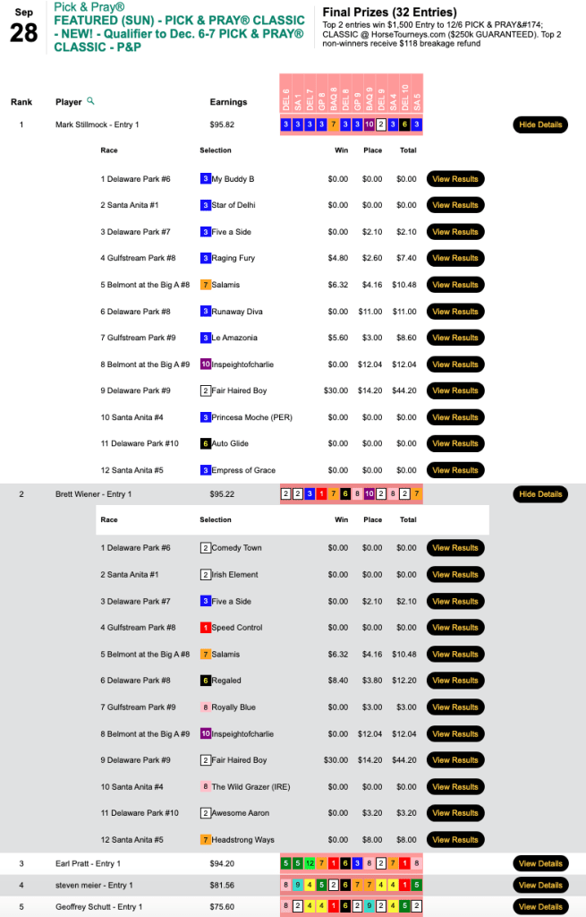 The only player to outdo Wiener in this one was no less than defending Pick & Pray Classic champion Mark Stillmock (4 wins, 3 places). In the 9th at Delaware, Stillmock and Wiener both favored Fair Haired Boy.