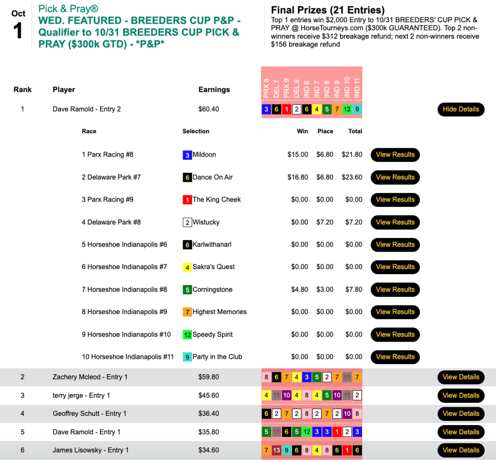 Arndt topped the leaderboard in Friday’s qualifier to the Keeneland Fall BCBC-NHC Challenge. Kirk Rockwell (4W, 1P) finished second to grab the other available $3,500 seat. Rockwell backed Imaginationthelady.
