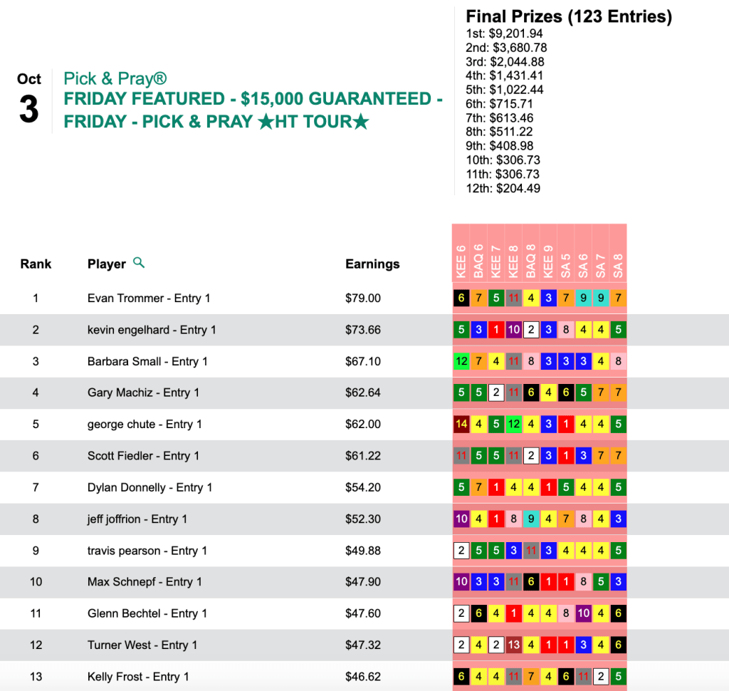 Machiz (4 winners on this day) and Mark “Santana” Tabakman (4 wins, 3 places) ran one-two in Sunday’s two-seat play-in to the inaugural BC Pick & Pray Tourney. Rythem Girl was present on both of their scorecards.