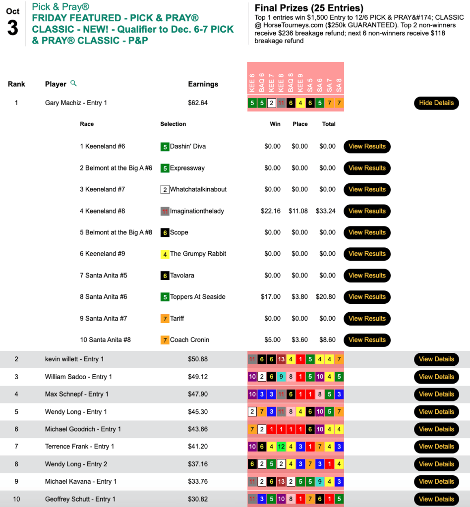 Machiz uncovered 3 winners—topped by Imaginationthelady ($22.16, $11.08) in the 8th at Keeneland—en route to victory in Friday’s Pick & Pray Classic qualifier.