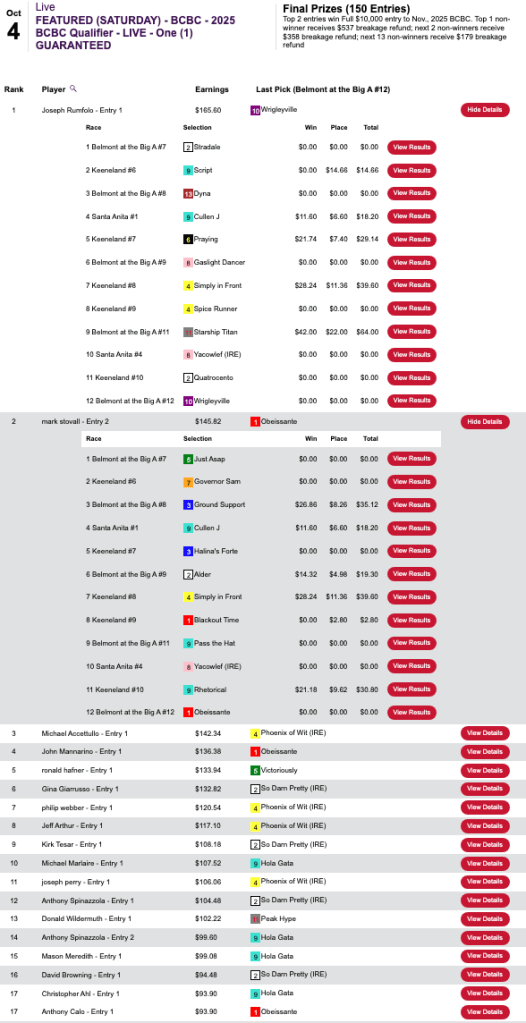Joseph Rumfolo (4 wins, 1 place) and Mark Stovall (5W, 1P) each reeled in $10,000 seats in Saturday’s $179 Breeders’ Cup Betting Challenge qualifier at HorsePlayers.