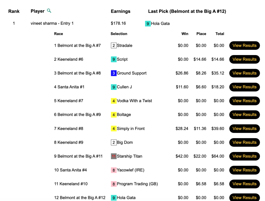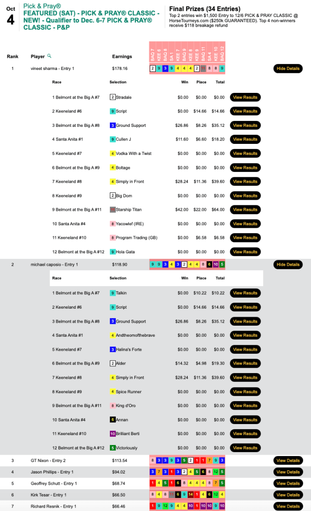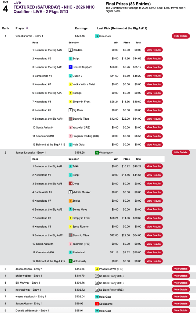 Sharma (4 wins, 2 places) put up the day’s top score ($178.16), and he and James Lisowsky (3W, 2P) got the two available Vegas packages in Saturday’s $165 NHC qualifier at HorsePlayers. They both tallied big with Starship Titan ($80.44, $32.56) in race 11 at BAQ.