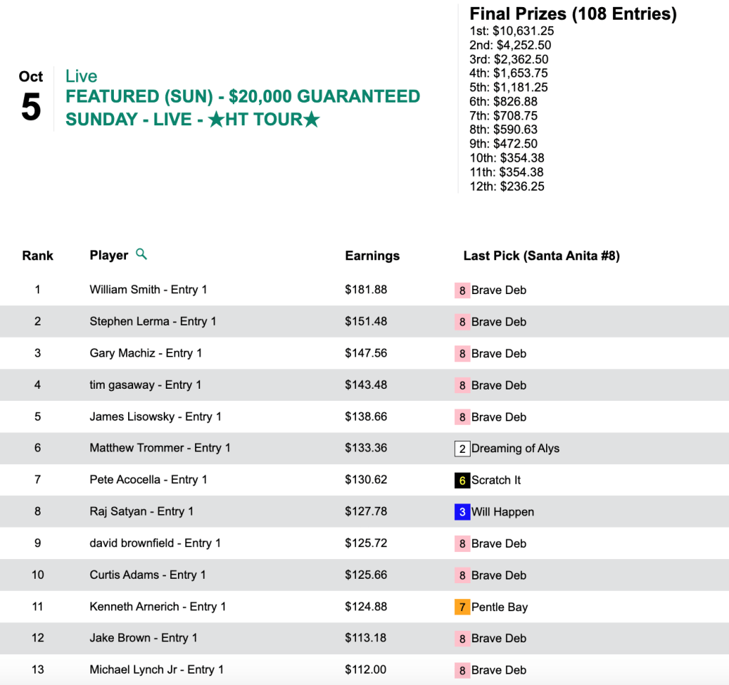 Rythem Girl (clearly not named by a spelling bee champion) was one of four consecutive winners fired off by Acocella in the course of taking both the NHC Low Ratio and Breeders’ Cup Low Ratio qualifiers at HorsePlayers on Sunday. Meanwhile, Raj Satyan gets his name in the Weekly Recap for what seems like the 17th straight week. Thanks to Rythem Girl plus two other winners and one runner up, Satyan got a $10,000 seat for finishing to Acocella in the BCBC-centric tilt.