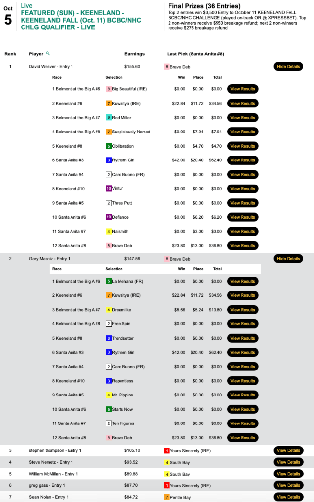 Finishing in second position—nearly $60 behind Sharma—was Michael Caposio, who garnered the other available seat for the $250,000 Guaranteed test here on Dec. 6-7. The biggest return for Caposio—who also got a Keeneland Fall BCBC-NHC Challenge seat for finishing behind Pete Acocella in the Saturday qualifier to it—came via Simply in Front ($28.24, $11.36) in the 8th at Keeneland.