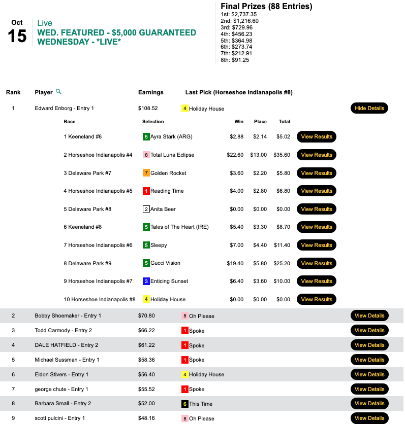 Enborg rattled off four straight winners at the outset—including Total Luna Eclipse ($22.60, $13.00) in the 4th at Horseshoe Indianapolis—and added another four winners later on to finish with eight on the day…from just 10 races. Enborg was a highly deserving recipient of the $2,737 grand prize in Wednesday’s $5,000 Guaranteed cash game, which closed with a final purse of $6,083.