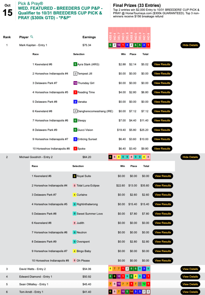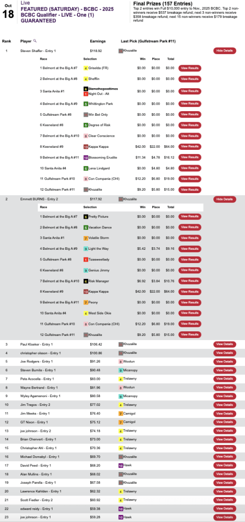 That began a run of 4 wins and 1 place over the final five races that brought Shaffer a $10,000 Breeders’ Cup Betting Challenge seat in Saturday’s $179 qualifier at HorsePlayers. Emmett Burns (5 winners) also smoked out Kappa Kappa from the AE list, and he, too, got a BCBC seat for finishing closest to Shaffer.