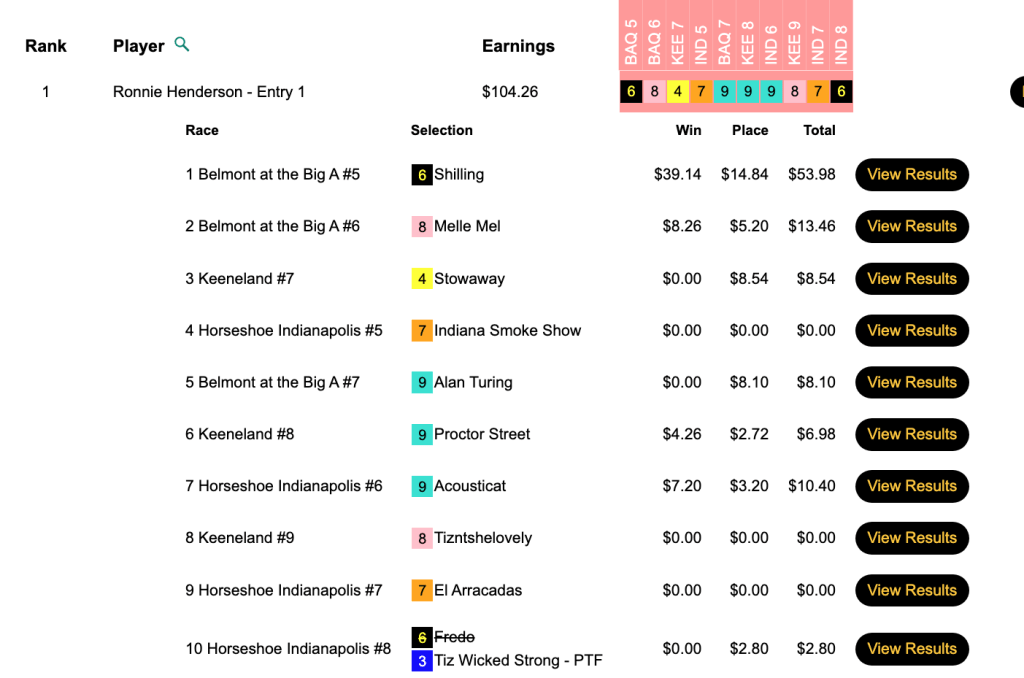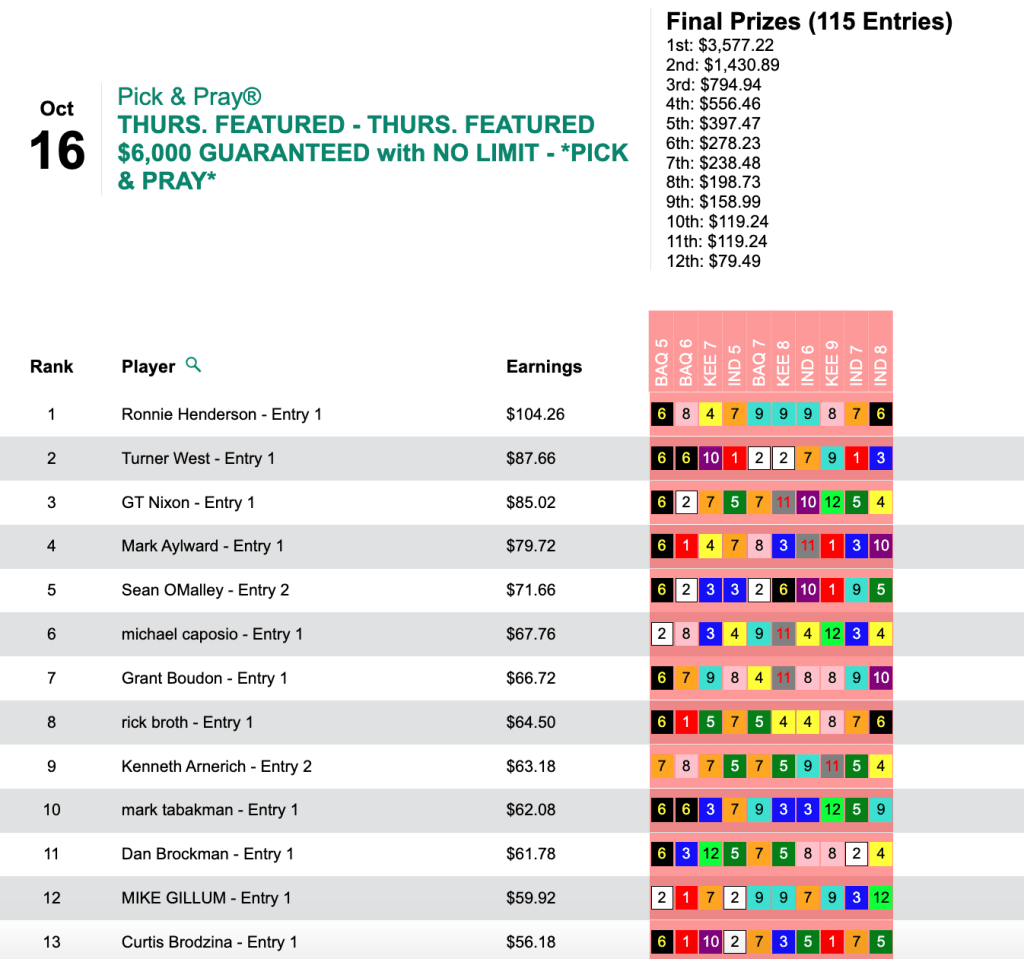 Ronnie Henderson (4 firsts, 3 seconds) took home the $3,577 top prize in Thursday’s $6,000 Gtd. Pick & Pray, which closed with a final pot of $7,949.