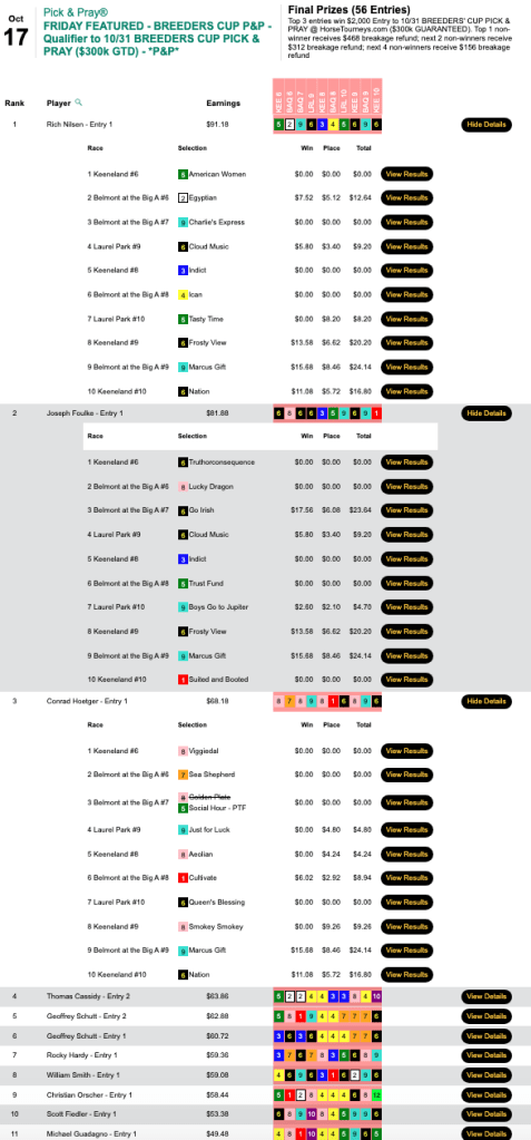 Nilsen (5 wins, 1 place) swept the final three contest races, including a tally with Marcus Gift ($15.68, $8.46) in the 9th at BAQ. He led a group of three $2,000 seat earners that was also comprised of Joseph “Kin” Foulke (5W, 0P) and Conrad Hoetger (3W, 3P) in Friday’s BC Pick & Pray Tourney qualifier. The top three all had Marcus Gift on their scorecards.