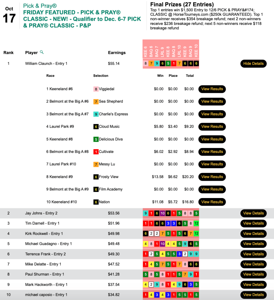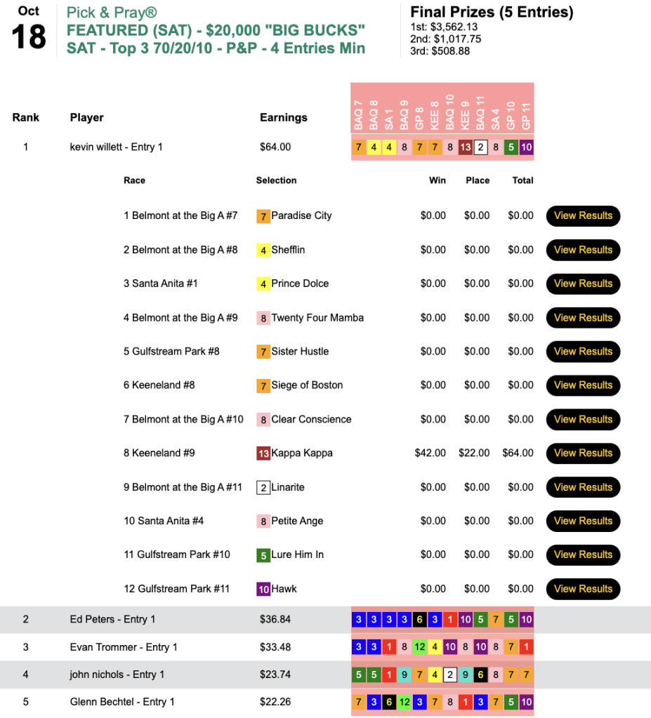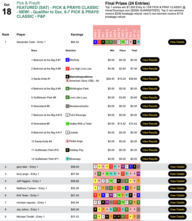 One day after Bob won his BCBC seat, sibling Kevin took our first qualifier to the Del Mar Fall Challenge thanks to 3 wins and 2 places. Runner up James Amedure (3W, 2P) also reeled in a $3,000 entry for November 29. For Kevin Engelhard, it was a nice follow up to his exploits of the previous week when he captured our Sunday cash feature plus a BC Pick & Pray seat.