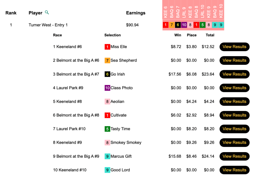 Hammerle and Watts were both sunk by the same horse, Steve Asmussen’s odds-on class dropper Mila Rose, who finished well up the track in the Keeneland opener. That meant that either Vasquez would be the big winner (if his pick later that day hit the board) or there would be a three-way tie (if Vasquez met the same fate as Hammerle and Watts.
