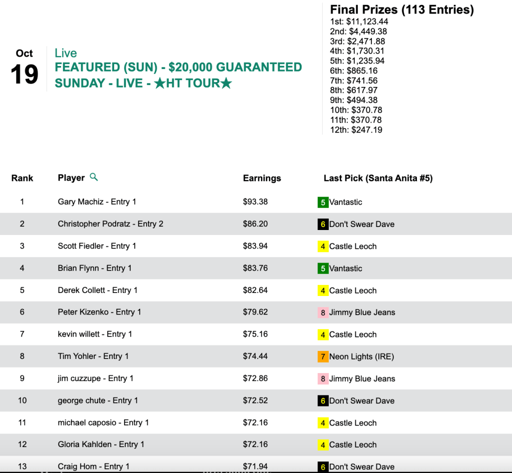Machiz hit each of the first three contest races prior to nailing Ready to Jam. The seven collections were worth $11,123 to Machiz in Sunday’s HT Tour test, our $20,000 Guaranteed tourney, which closed with a final prize pool of $24,718.