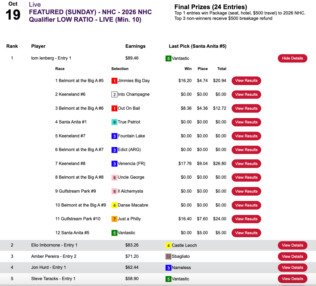 Thanks in no small part to the cap horse, Kolschowsky (3 firsts, 1 second) punched his ticket to Vegas in Saturday’s $210 NHC qualifier at HorsePlayers—a get together that was restricted to those who had yet to nail down a 2026 seat.
