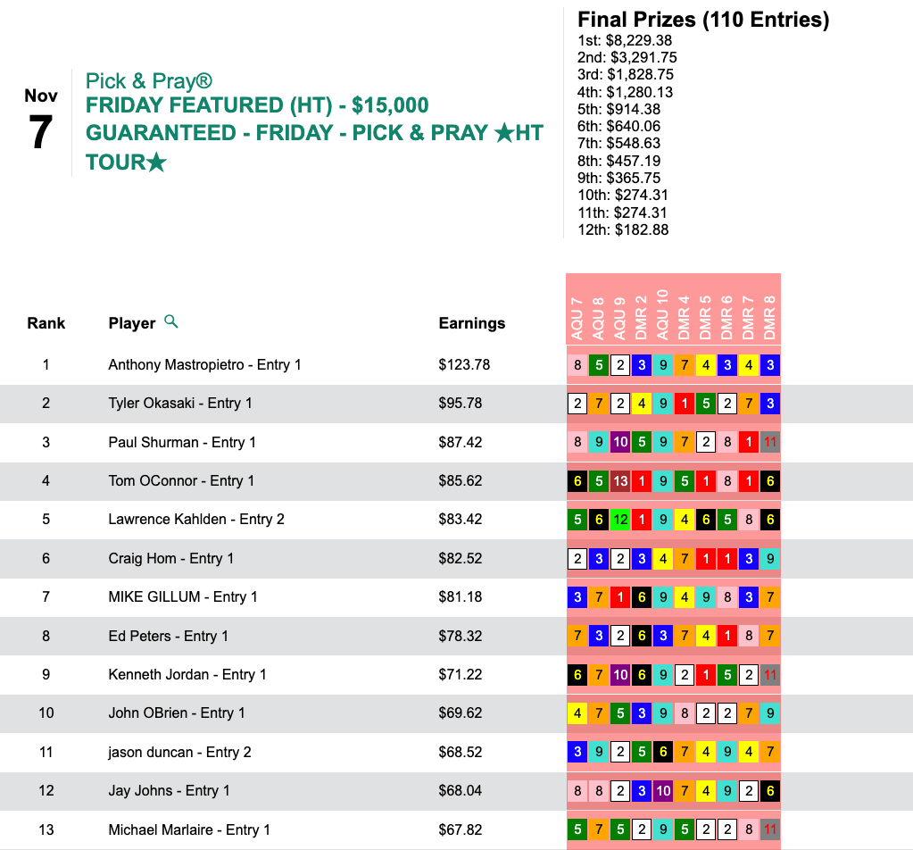Friday’s cash-game here was Anthony Mastropietro (3 firsts, 2 seconds).