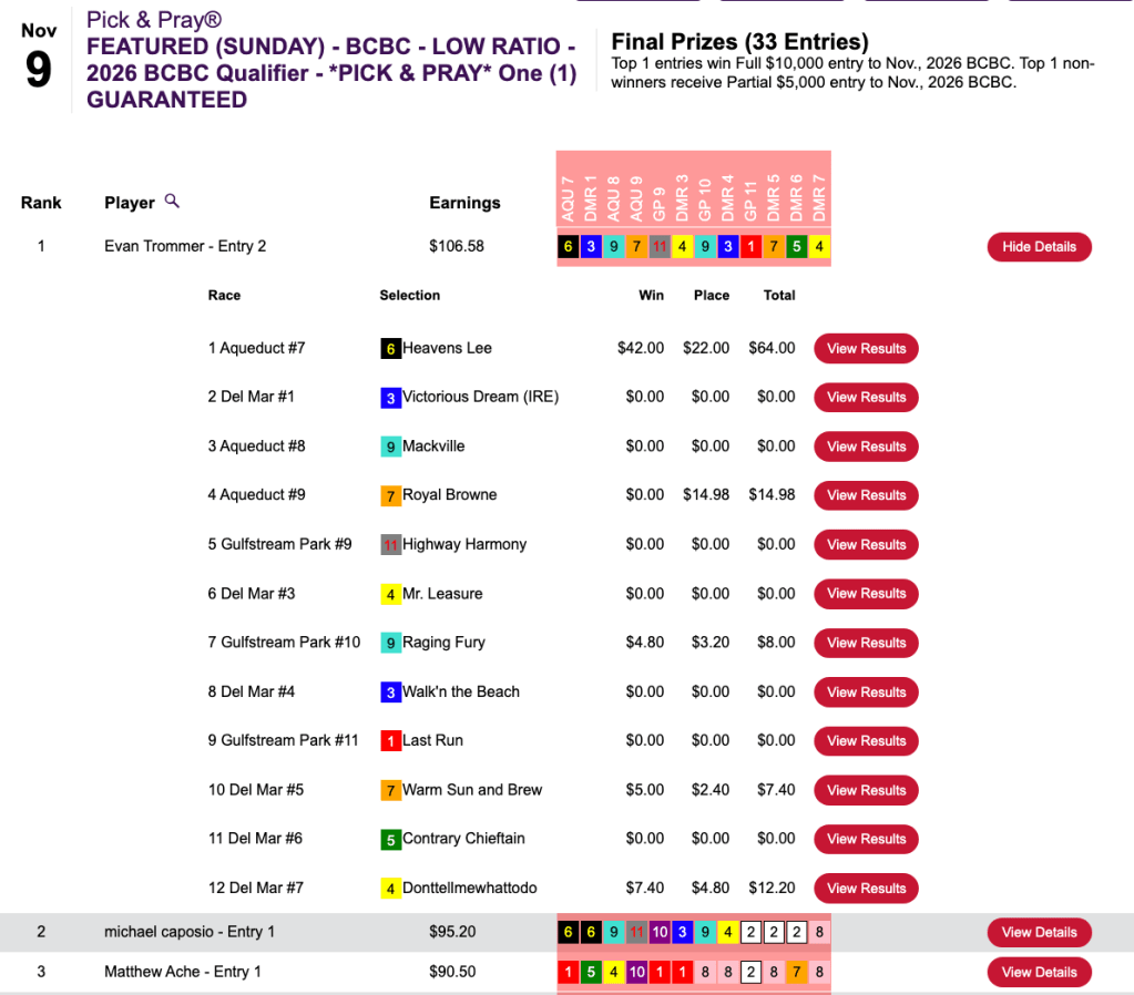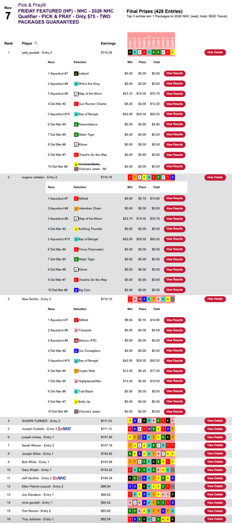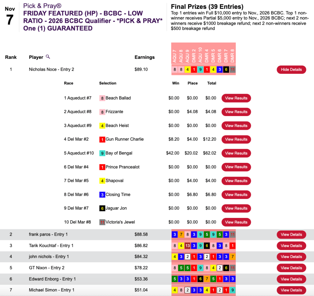 Noce (2 wins, 3 places) got the $10,000 seat in Friday’s Low Ratio qualifier to the Breeders’ Cup Betting Challenge. (This was the first qualifier to the 2026 BCBC—now just a mere 51 weeks away!) Frank “Plaster of” Paros finished second—good for a $5,000 partial entry.