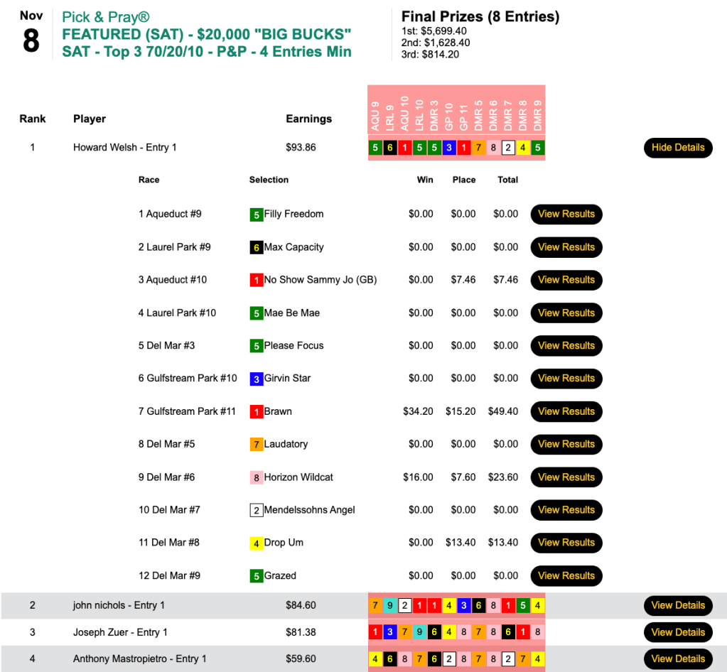 Howard Welsh (2 wins, 2 places) took home the $5,699 grand prize in Saturday’s $8,142 Big Bucks Pick & Pray.