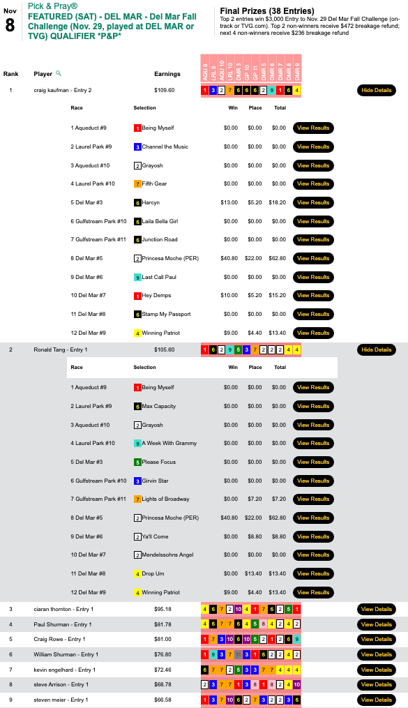 Using the same Saturday selections, Ronald Tang also obtained a $3,000 Del Mar Fall Challenge entry.