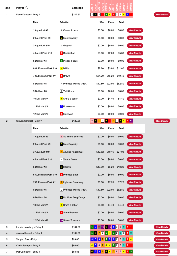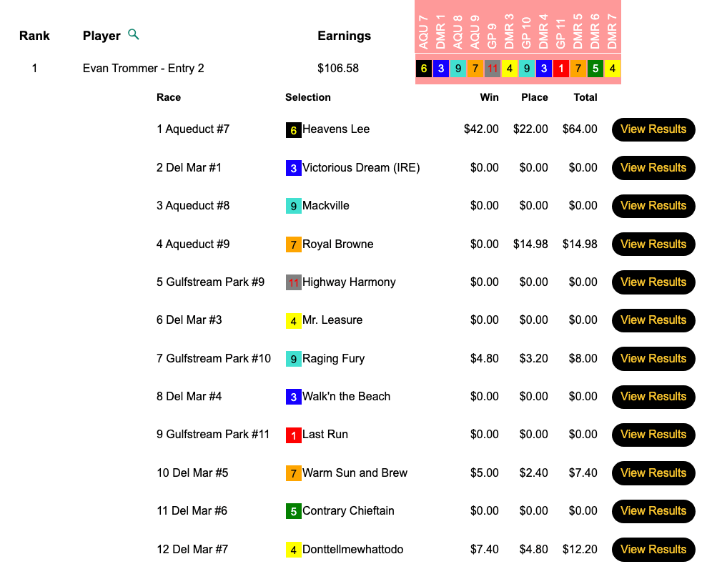 Meier’s best pick was Bay of Bengal. The top return for Nichols came with Map of the Moon ($23.74, $10.02) in the 9th at Aqueduct. Nichols’s bid for a Pick & Pray Classic seat would have cratered, however, had he not selected Lady K Westfall ($4.80, $2.80) who held on by a desperate nose in the final contest race, the 8th at Del Mar. The 7-5 winner got Nichols up for 2nd by a scant 94 cents over an unfortunate Michael “Copa” Kavana.