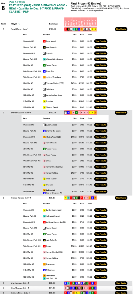 Kavana (2 wins, 3 places) secured the third and final $1,500 seat available in Saturday’s Pick & Pray Classic qualifier. The two who finished above him were Dr. Ronald Tang (2W, 3P) and Charles Welch (2W, 5P). Tang’s most lucrative pick was Princess Mocha ($40.80, $26.00) in race 5 at Del Mar. Welch’s score was most bolstered by Alluring Angel ($17.82, $10.16) in the 10th at Aqueduct. Kavana’s biggest strength was Brawn ($34.20, $15.20) in the 11th at Gulfstream.