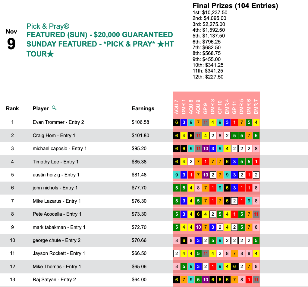 Trommer added 3 more winners and 1 runner up thereafter, and he pocketed the $10,237 top prize in Sunday’s HT Tour skirmish, our $20,000 Gtd. Pick & Pray, which closed with a final purse of $22,750.
