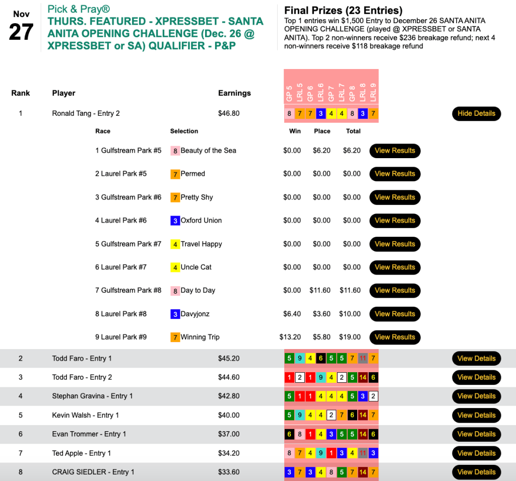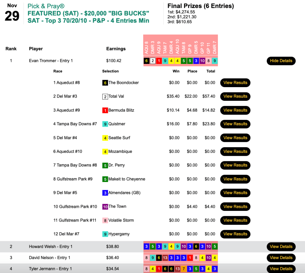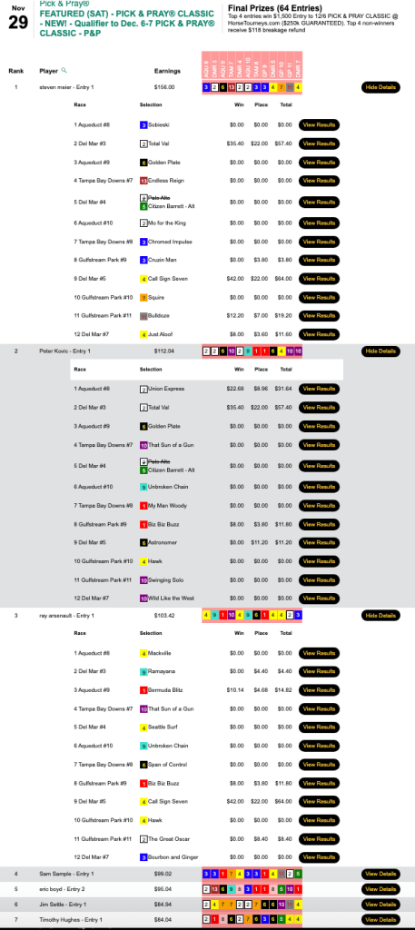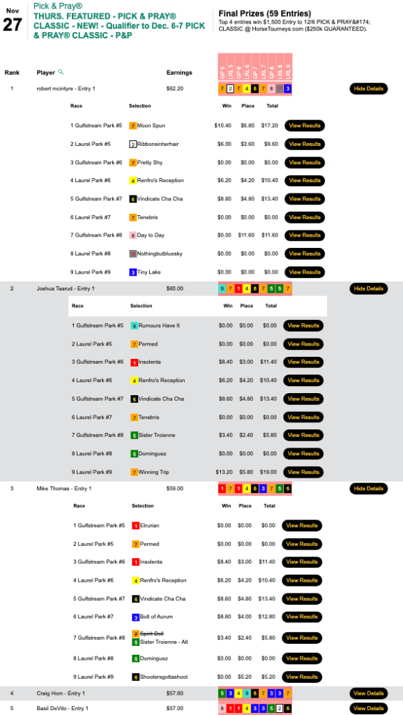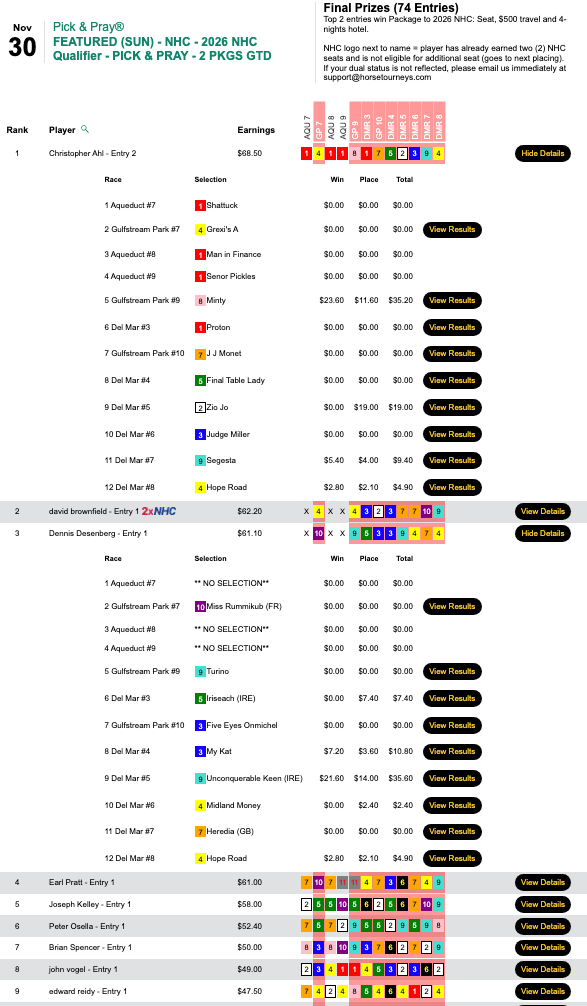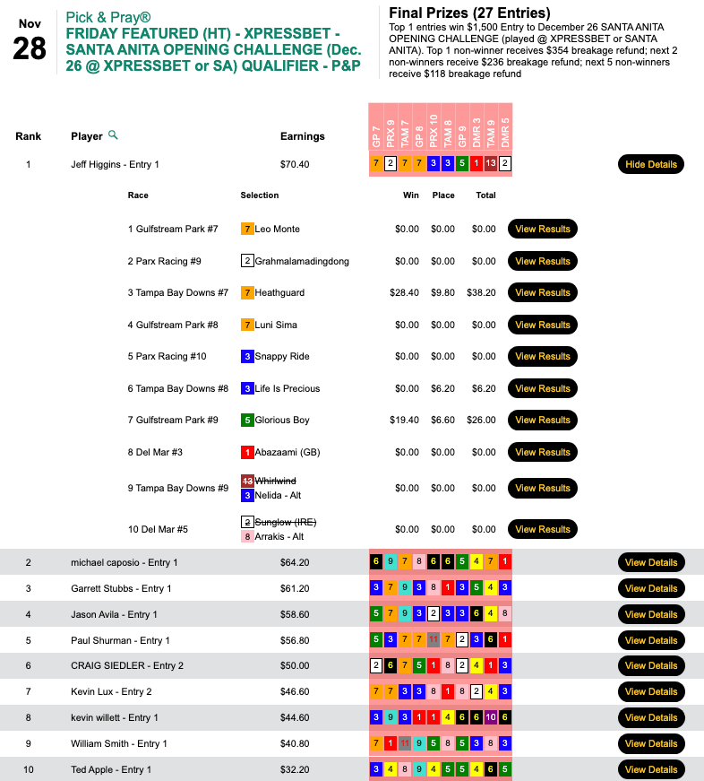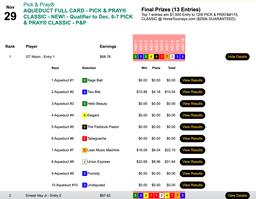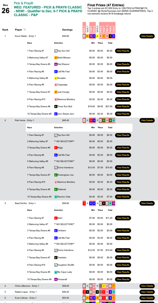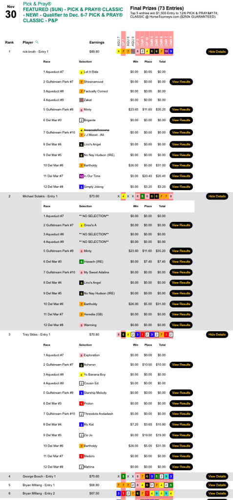 Next weekend is the final HT “major” of the year—the $250,000 Gtd. Pick & Pray Classic, which serves as the final leg of the five-event HT Champions Series. Players will be making mandatory, Pick & Pray selections on 15-20 races each day from an array of tracks that figures to include Aqueduct, Gulfstream, Laurel and (on Saturday) Tampa Bay Downs. Qualifiers continue all week, and buy-ins will be available right up until the first P&P Classic race on Saturday. (Just leave yourself time to completely enter your Day 1 picks, of course.)