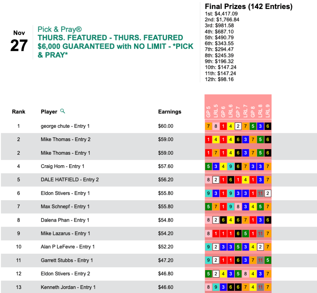 That $60.00 tally gave Chute a $1.00 margin of victory in Thursday’s $6,000 Gtd. Pick & Pray.