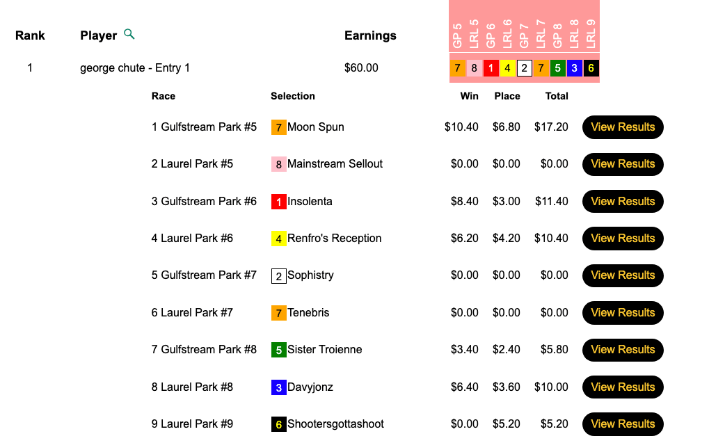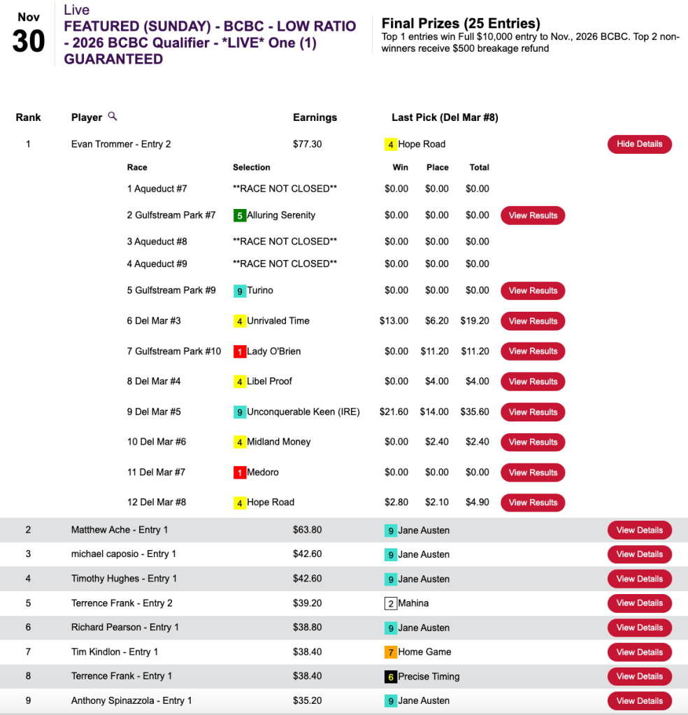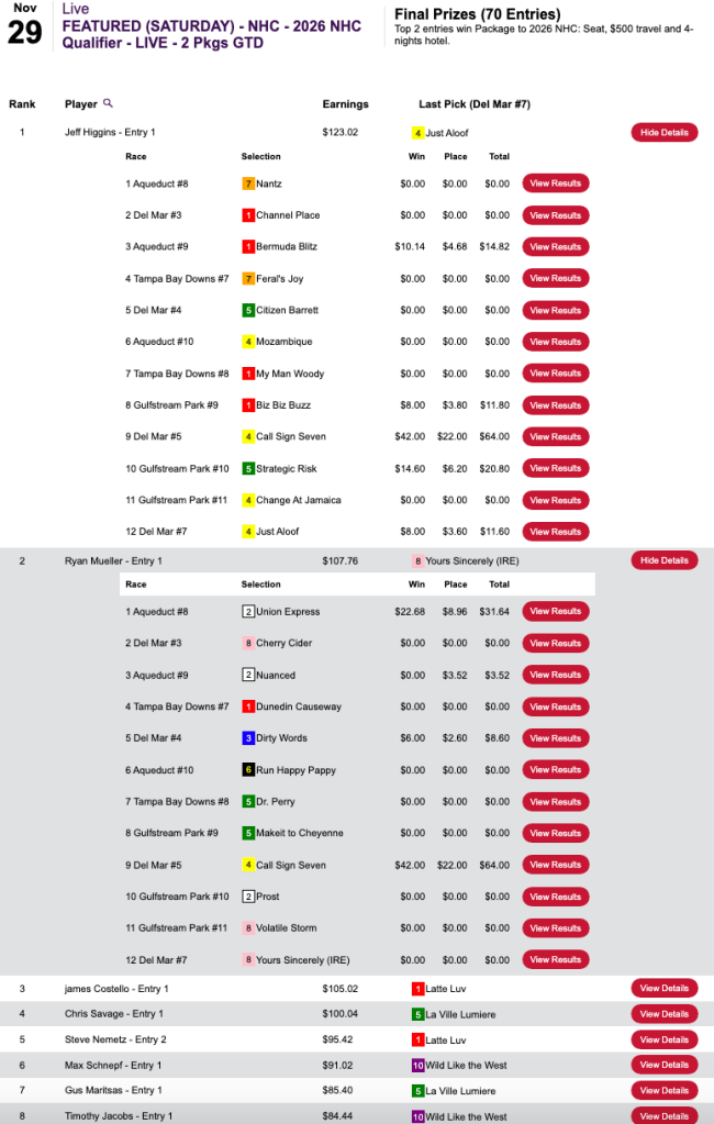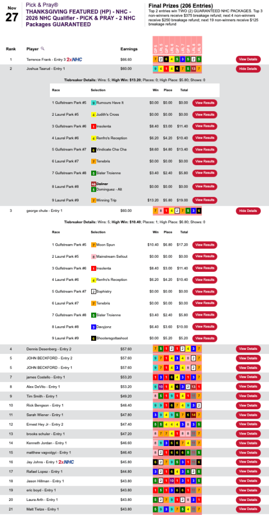 Terrence Frank led the way in Thursday’s 2-seat, $125 NHC qualifier at HorsePlayers, but Frank was already double qualified. That left the Vegas packages to Joshua Taarud (5 wins, 0 places) and George Chute (5W, 1P), who tied for second with $60.00 each. Taarud scored with Winning Trip ($13.20, $5.80) in the final contest race, the 9th at Laurel. Chute’s best hit came at the start with Moon Spun ($10.40, $6.80) in race 5 at Gulfstream.