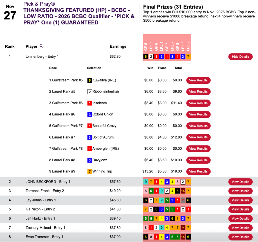 The Laurel race 9 victor was one of five Turkey Day winners for Lenberg, who captured Thursday’s Breeders’ Cup Betting Challenge Low Ratio Pick & Pray at HorsePlayers.