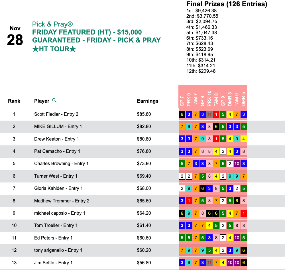 He emerged from the crowds with four of them—plus two runners up—and he got the $9,426 grand prize in Friday’s HT Tour battle, our $15,000 Gtd. Pick & Pray, which closed with a pot of $20,947. Fiedler’s stable star was Heathguard ($28.40, $9.80) in the 7th at Tampa Bay Downs.
