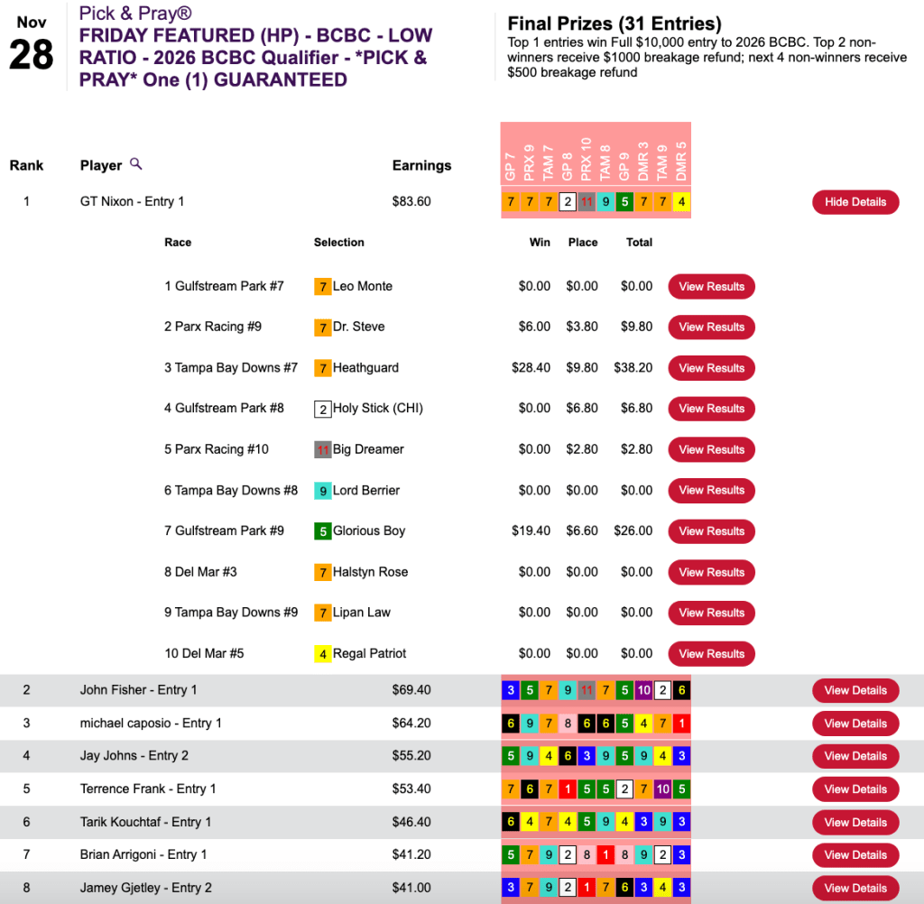 G.T. Nixon was the one in Friday’s Breeders’ Cup Betting Challenge Low Ratio qualifier at HorsePlayers.