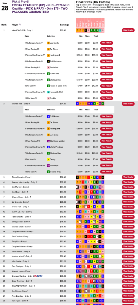 Redman hopes to be strutting his stuff again this weekend in the Pick & Pray Classic (final leg of the 2025 HT Champions Series). Joseph “Keith” Foulke (5 wins, 1 place), Steve “The Admiral” Nemetz (4W, 0P) and Thomas Kolschowsky (5W, 1P) also grabbed $1,500 spots in this four-seater. Kolschowsky was the only Friday grand-prize winner who didn’t play Heathguard. His most profitable selection was Glorious Box ($19.40, $6.60) in race 9 at Gulfstream.