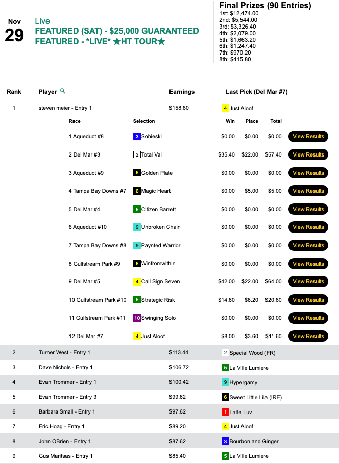 Meier (4 firsts, 1 second) nailed cap horse Call Sign Seven ($139.00, $37.60) in the 5th at Del Mar, and he rolled to a $45.00+ victory in our richest tourney of the week, Saturday’s $25,000 Guaranteed cash game, which closed its doors with $27.720 in the kitty.