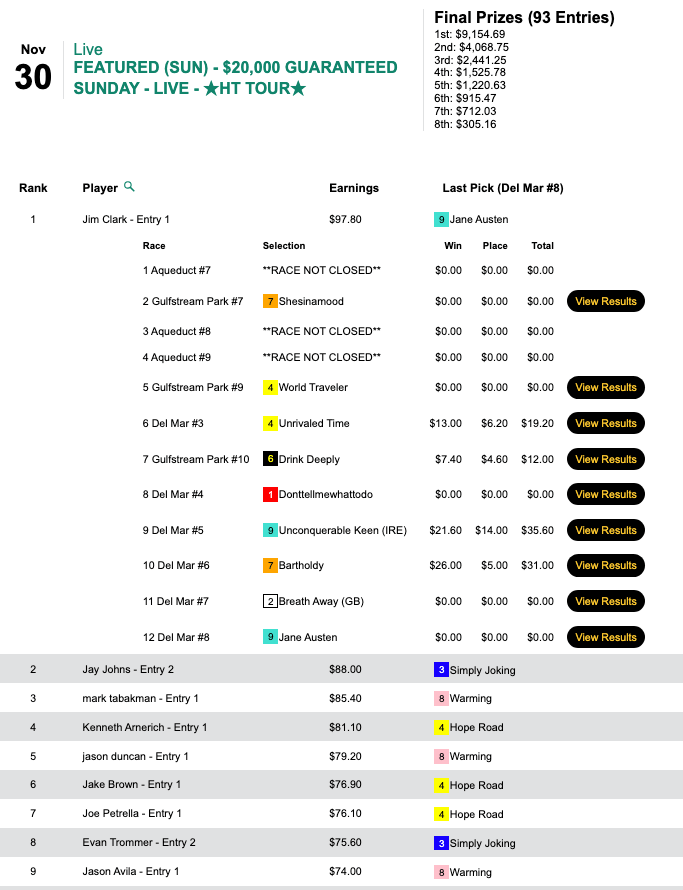 On this day, his “set-it-and-forget-it” selections in Live tourneys yielded 3 wins and 3 runners up. His big horse was Unconquerable Keen ($21.60, $14.00) in race 5 at Del Mar. (The place hole was certainly kind to Trommer last weekend!)