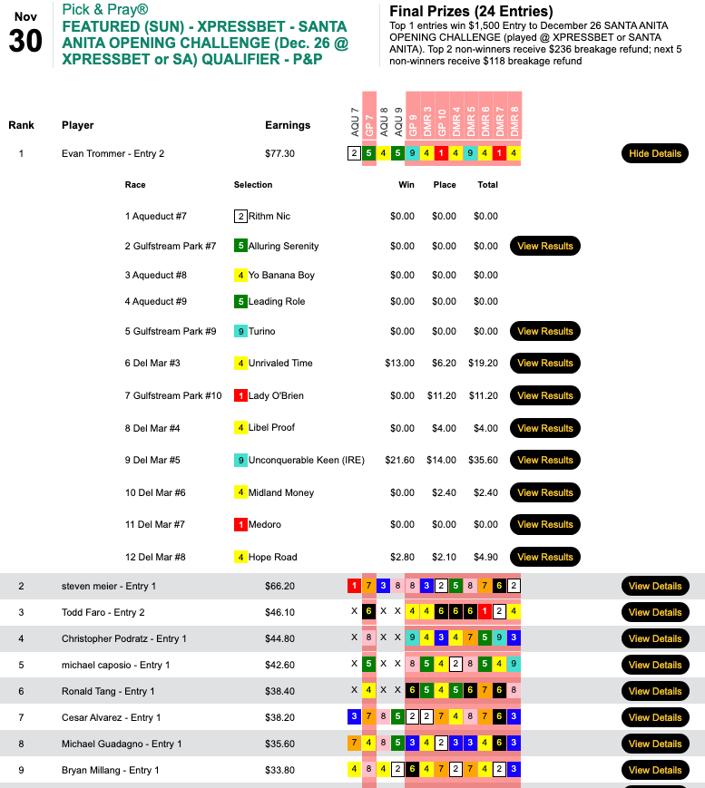 Anyway, Trommer landed the $1,500 berth in Saturday’s qualifier to the December 26 Santa Anita Opening Day Challenge.