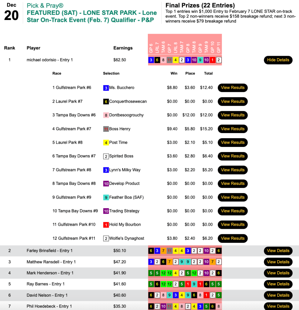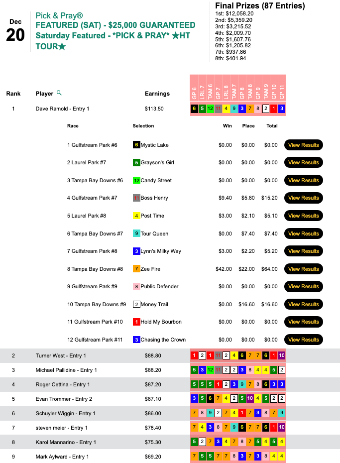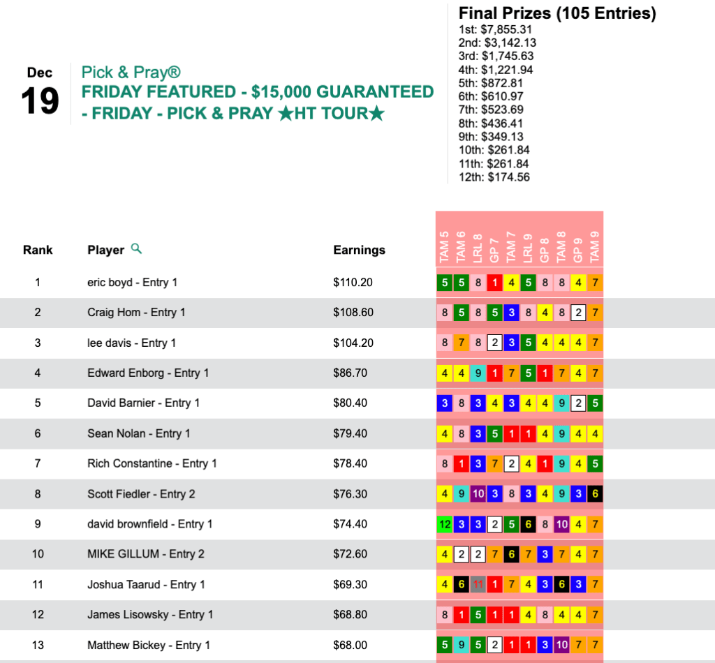 Utilizing the same selections, Brodzina also banked $11,320 for capturing Sunday’s HT Tour battle, our $20,000 Gtd. Pick & Pray, which closed with a final purse of $25,156.