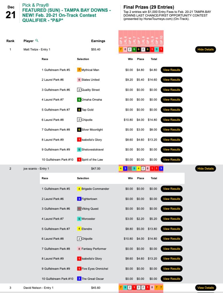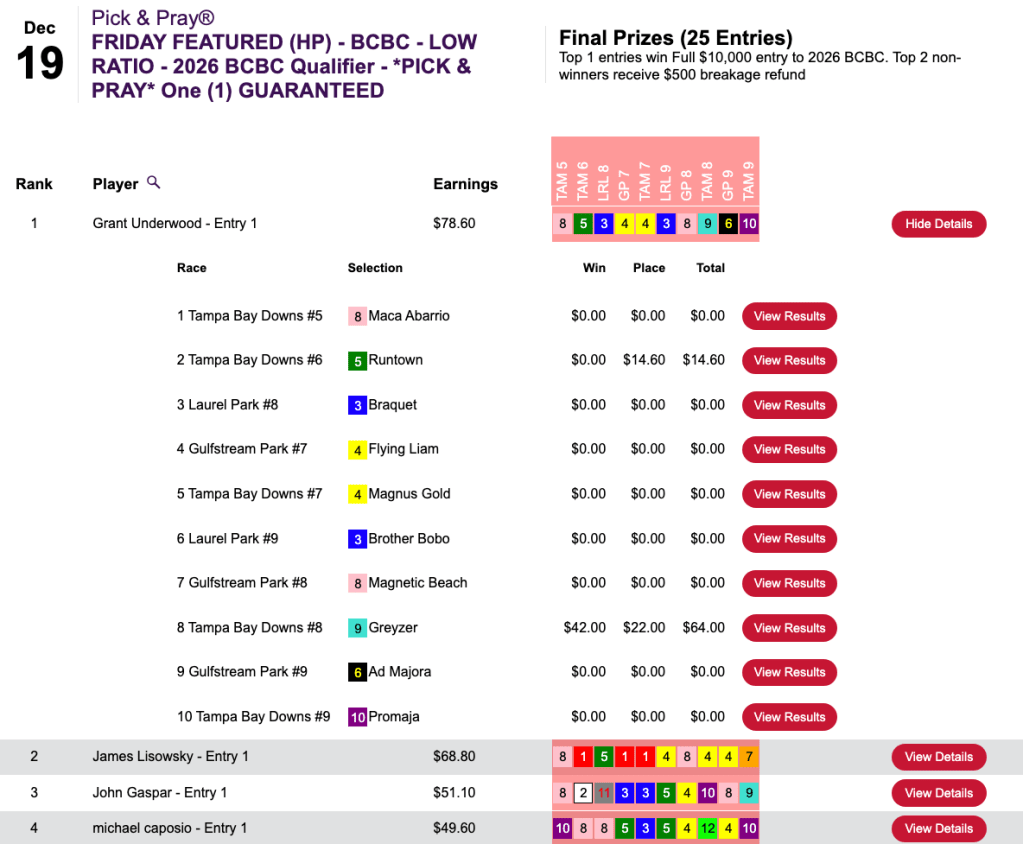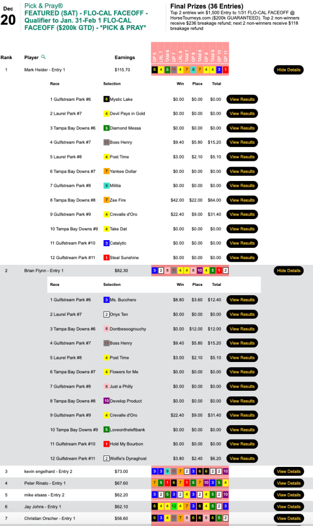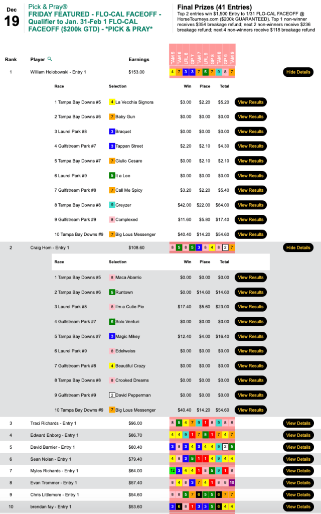 There were two giant prices in races 8 and 9 at Tampa on Friday and Boyd (3 wins, 4 places) had ‘em both—Greyzer ($92.60, $32.60) in the 8th and Big Lous Messenger ($40.40, $14.20) in the 9th. Boyd’s gaudy final score of $174.20 got him the top spot in Friday’s $75 NHC qualifier at HorsePlayers. The runner up, Jill Matzat, was already double qualified. So that left the other available Vegas package to third-place finisher Jim Henry (3W, 2P). He also sniffed out both legs of the lucrative Tampa “late double”.