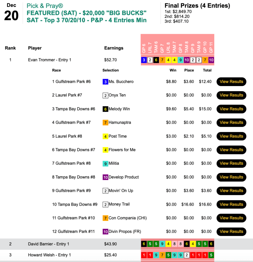 Congratulations to Chris Bahr (6 wins, 2 places) and Steven Meier (2W, 1 P). Bahr scored with Big Lous Messenger at the end. Meier hit Greyzer a half hour before that.