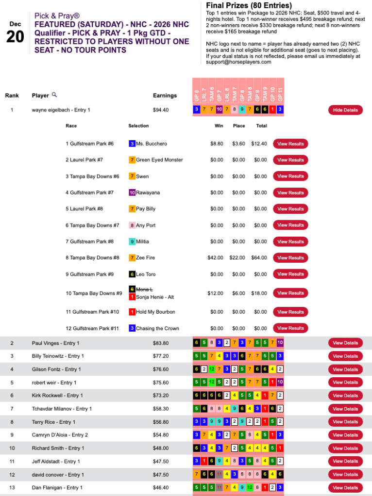 The other Saturday featured tourney at HorsePlayers was a $165 NHC qualifier that was restricted to those who had yet to secure a 2026 seat.