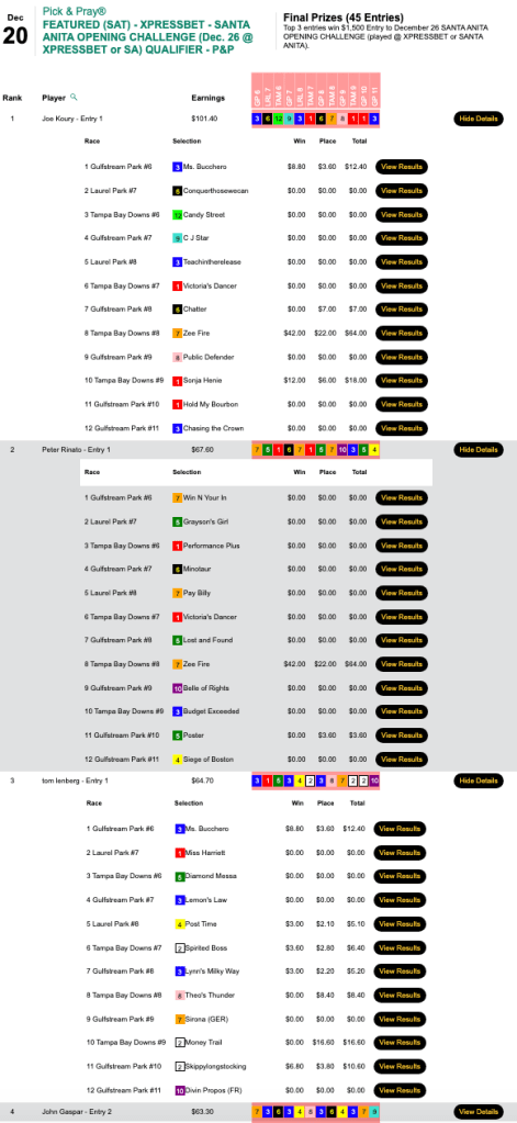 They went to The People’s CFO, Joe “JK” Koury (3 wins, 1 place), Peter Rinato (1W, 1P) and Tom Lenberg (5W, 2P). Koury and Rinato each connected on the day’s big bomb—Zee Fire ($64.00, $22.20)—in race 8 at what was the home of big prices last week, Tampa Bay Downs. Lenberg’s best return came from Money Trail, who paid $16.60 to place after running 2nd in race 9…at Tampa.