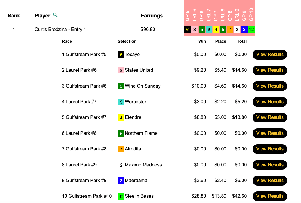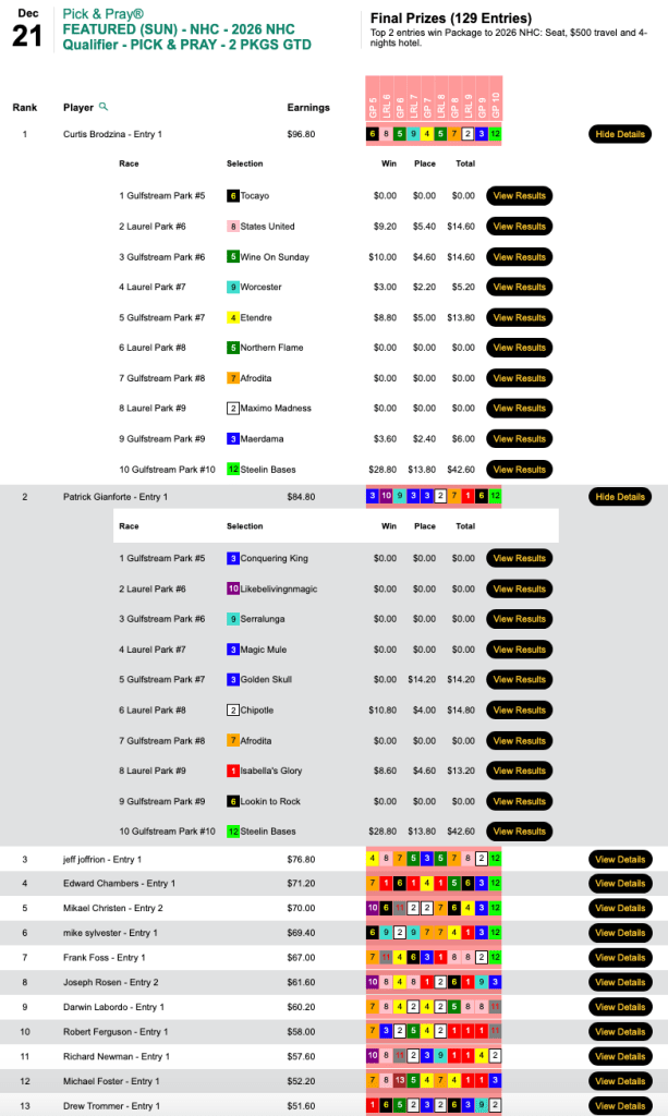 Brodzina punched his ticket to Vegas on Sunday, picking 6 winners en route a first-place finish in the $165 qualifier here at HorseTourneys. He and fellow package winner Patrick “Gino” Gianforte (3 firsts, 1 second) both hit the day’s biggest price — Steelin Bases ($28.80, $13.80) — in the final contest race, the 10th at Gulfstream.
