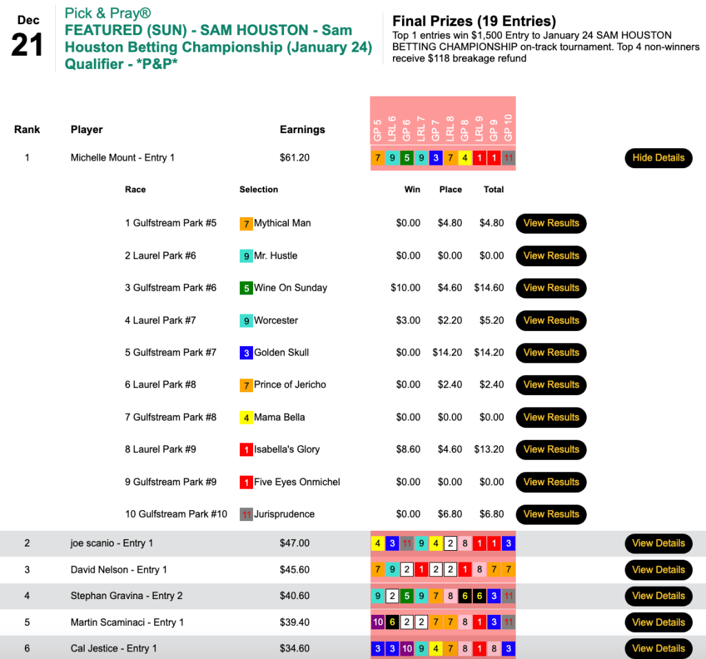 Due to the cancellation of racing first at Parx and later—after two races were run—at Mahoning Valley, we lost our Wednesday featured schedule. As a result, our first marquee game last week was Thursday’s $6,000 Gtd. Pick & Pray, which closed with a pot of $7,811.